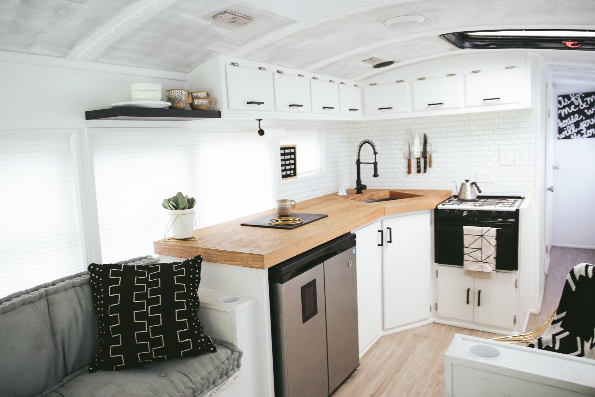 We mainly did finishing touches like the tile, painting etc. We hired a company to build out the main structure of the bus but we don't recommend them because their workmanship was not good. We still have plumbing issues that they haven't fixed and there were leaks in the roof, the hot water heater wasn't working...a list of about 40 items that were not working correctly. We've had someone come out and fix most of the issues but it was extremely frustrating and disappointing. The total conversion cost 38k.